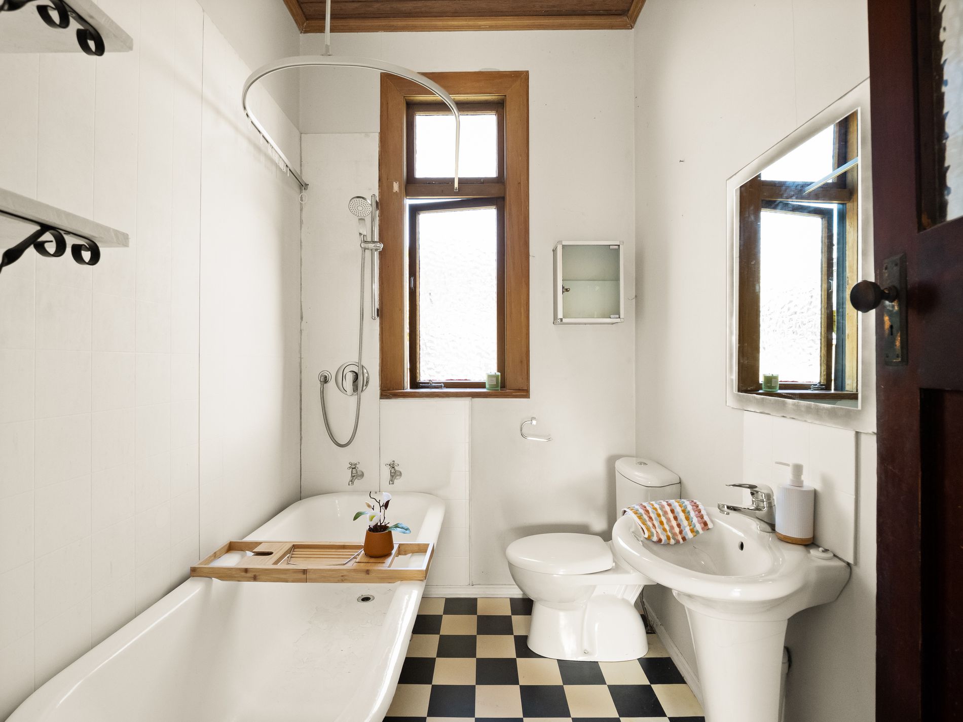 The bathroom stays true to the home's character, complete with a clawfoot bath and generous space.